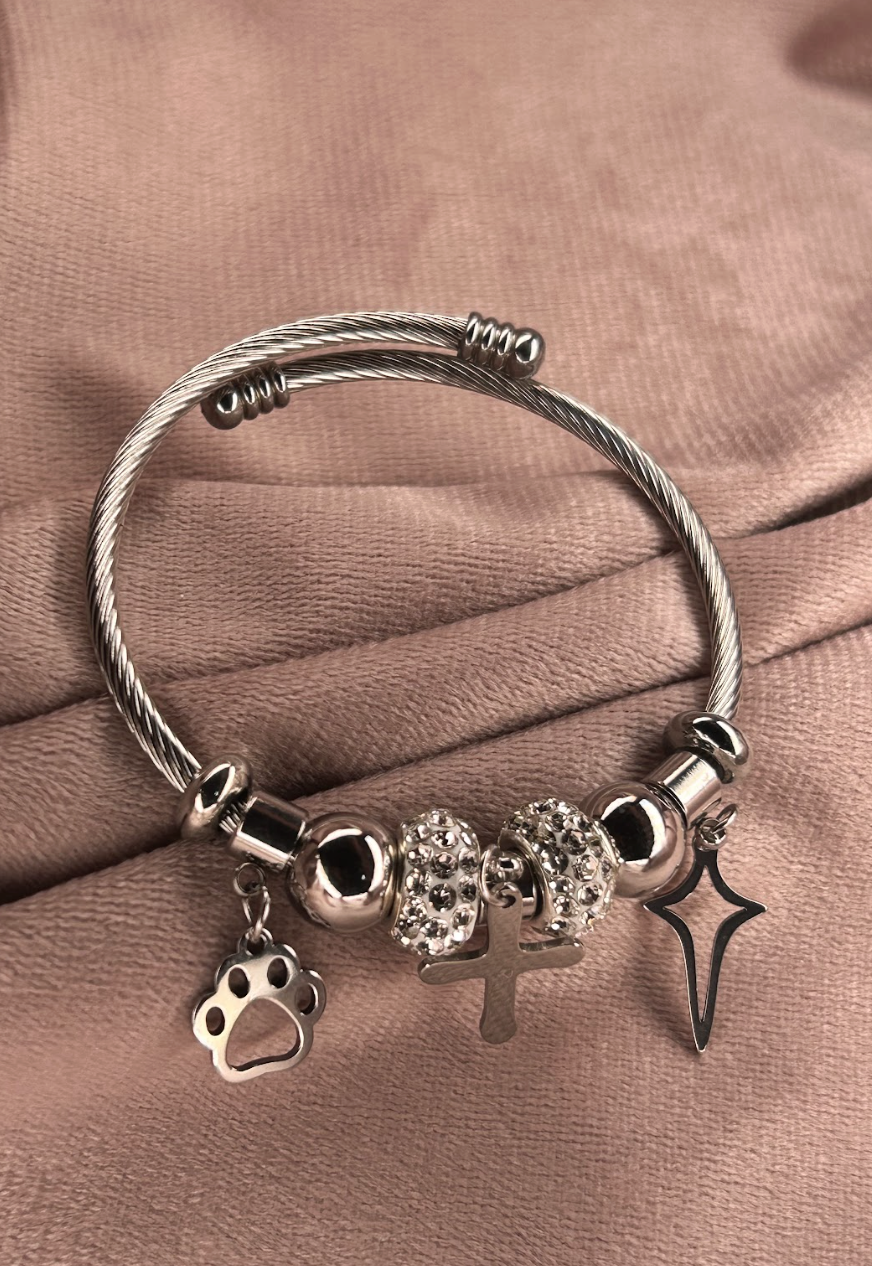Este bracelete em aço inoxidável destaca-se pelo seu design em cabo torcido flexível, que oferece um visual moderno e industrial, equilibrado pela delicadeza dos seus berloques. Com acabamento impecável, a peça traz elementos que simbolizam proteção e amor: uma cruz clássica, uma estrela guia e uma patinha (pet lover), intercalados por separadores cravejados em cristais que garantem o ponto de luz ideal.