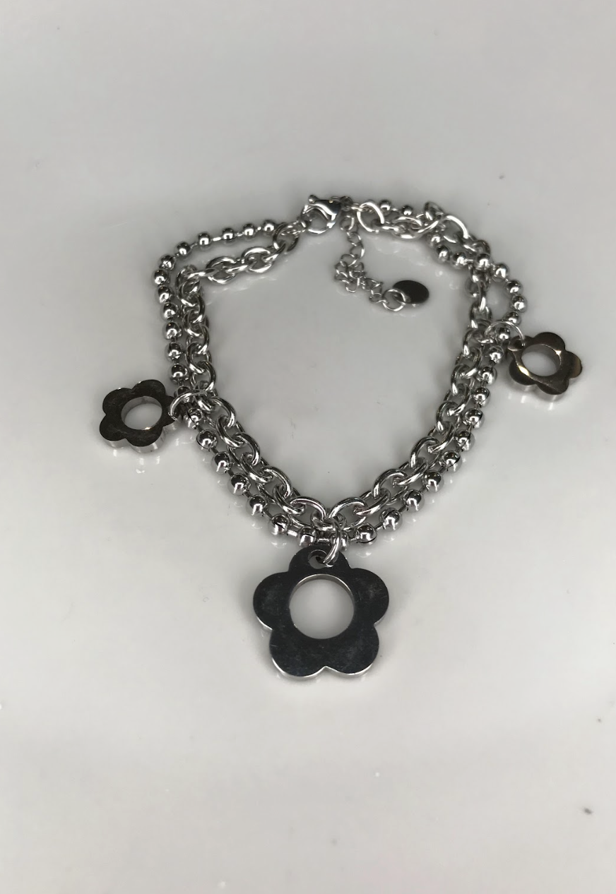 Esta pulseira exclusiva traz a tendência do layering (camadas) em uma única peça. Composta por duas correntes distintas uma de elos entrelaçados e outra de esferas polidas ela é adornada por três pingentes de flores vazadas que trazem movimento e leveza ao pulso. Uma peça de inspiração botânica que une a delicadeza do tema floral com a robustez e o brilho eterno do aço inoxidável.